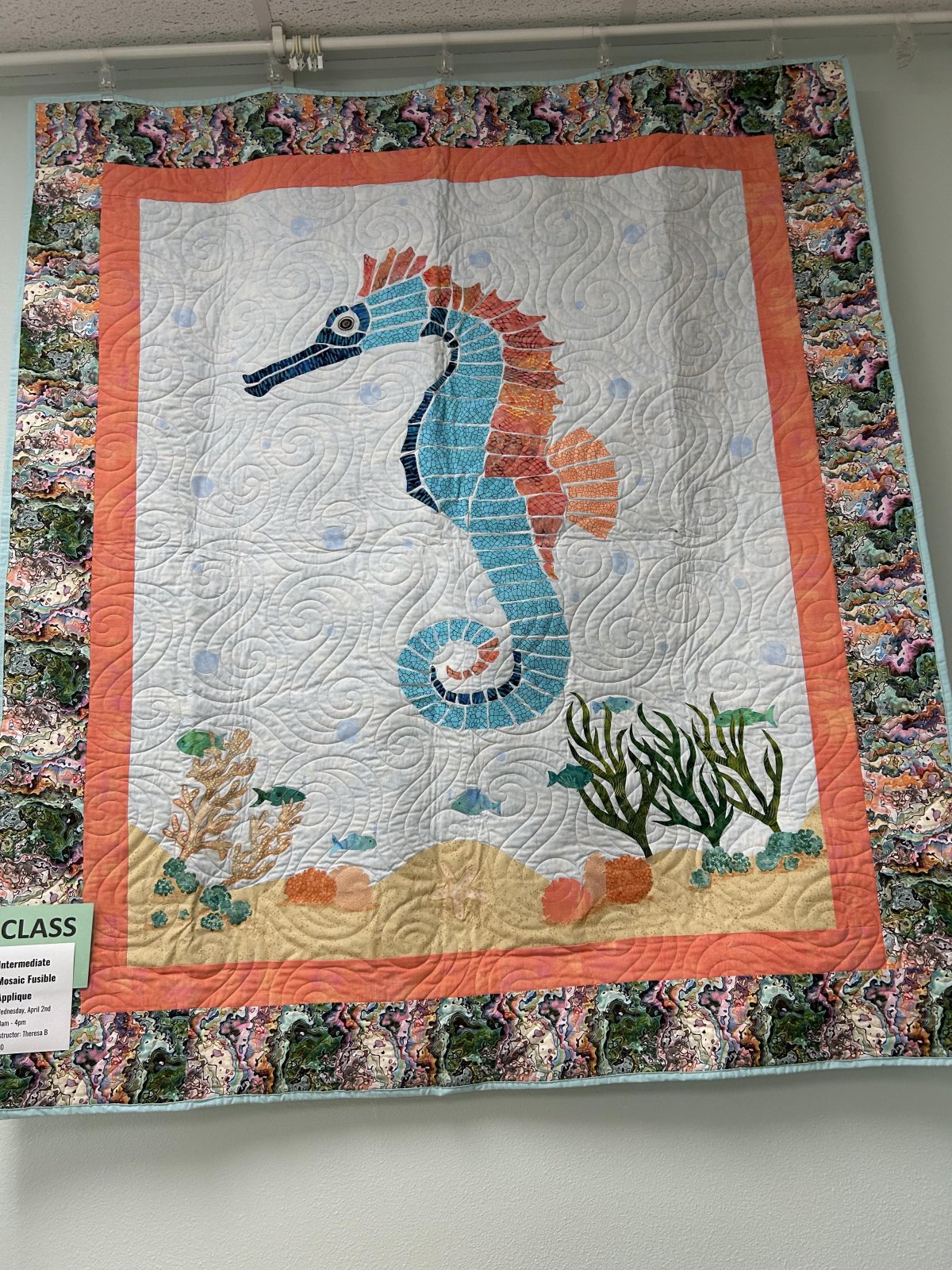 Patterns on the Prairie by Cindy Bader. Your choice of Butterfly, Dragonfly, Dahlia, Sea Horse, Sea Turtle, Tiger, Elephant, or Giraffe patterns for a wall hanging. It is required to have taken the Beginner Mosaic Applique class prior to taking this class. You should complete your quilt top in class.